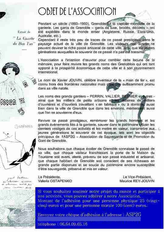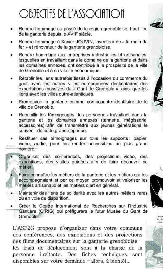 Revivre ce passé prestigieux, remémorer les grands hommes et les grands événements liés à la ganterie, sauver dans le patrimoine urbain les derniers vestiges de ces activités et les mettre en valeur, soutenir les gantiers encore en activité, tels sont les objectifs principaux des activités de l'ASP2G – Association de Sauvegarde et de Promotion du Gant de Grenoble.